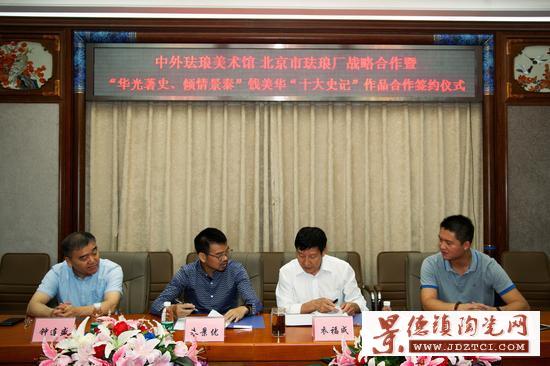 圖一 中外琺瑯美術(shù)館、北京市琺瑯廠領(lǐng)導(dǎo)衣福成(右二)、朱景優(yōu)(左二)、鐘連盛(左一)、許江華(右一)簽署錢美華“十大史記”作品合作協(xié)議現(xiàn)場(chǎng)