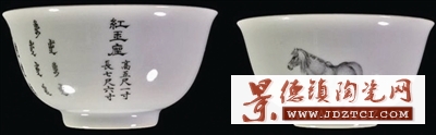 如果它不出自郎世寧之手,至少出在與郎畫技不分伯仲的宮廷一流畫師之手?墒琴|疑者照本對照,查閱了石渠寶笈中記錄的郎世寧十駿圖,發(fā)現琺瑯彩碗上的有一匹馬和畫上的同一匹馬,名字和尺寸都不同了,這究竟是畫錯了還是碗錯了?還有紅玉座這匹,畫上渲紅色應是對的,碗上卻畫成了黑色。如此推斷,瓷胎畫琺瑯應屬仿品!如果對琺瑯彩瓷沒有過認真的研究,得出此結論尚可原諒。但如果我們按常理想一想,既是照本臨仿往往不會將簡單的名字也仿錯?不排除一時走神抄錯了名字和尺寸,但絕不會將紅色臨成黑色!因此,仿品說是站不住腳的。何況碗上瓷畫的藝術造詣絕不弱于絹本上的,加之瓷胎上更難于運筆。所以,仿品論難以成立。