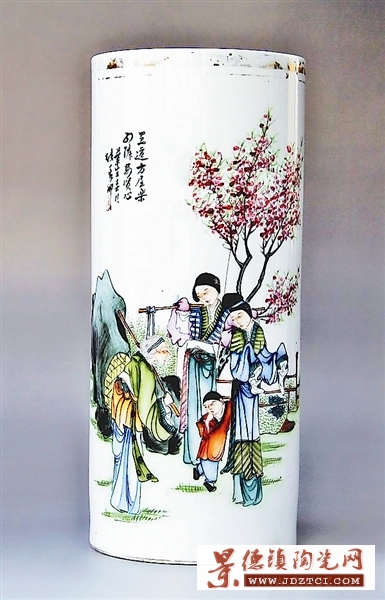 《三字經(jīng)》中有“昔孟母,擇鄰處”的傳誦名句,說的是在戰(zhàn)國時,孟子的母親為了讓孟子有個好的學習環(huán)境,曾三次搬遷自己的住處。正因為孟母對兒子的悉心教育,才使孟子成為中興儒學的“亞圣”。這個粉彩帽筒就繪有孟母三遷故事圖:孟母穿著布衣,雙手微舉,嘴唇微動,似乎在向前方老婆婆打聽附近的情況。旁邊的侍女用竹竿挑著行李,靜靜地站立。前方的老婆婆頭發(fā)花白,肩扛竹竿,身背竹簍,脊背彎曲,似乎在回答孟母的問題。小孟子一手拉著母親的衣角,一手放在嘴角,像在思考著什么。背景是一棵開滿紅花的樹,亭亭玉立。此帽筒高28厘米,口徑12厘米,釉面滋潤,畫工精細,色彩舒雅。