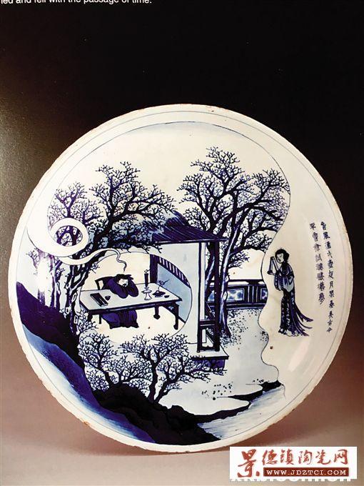 其中,上海博物館就藏有一件“明崇禎 青花錢塘夢故事圖盤”,正是17世紀(jì)描繪典故的陶瓷代表之一。這個盤以釉下青花裝飾,表現(xiàn)的是蘇小小和司馬才仲之間愛情的神奇?zhèn)髡f。畫面中有一帶月洞門和回廊的卷棚頂建筑,四周古樹參天,山石奇峻,前面湖泊蕩漾,后有欄板圍繞,屋內(nèi)一中年男子坐在官帽椅上,正伏案酣睡,案幾上放有燭臺、花插、冊頁和酒杯。畫面的右側(cè)一青年女子正手持響板而歌,“春風(fēng)酒一壺,夜月琴三弄。古今罕曾無,試聽錢塘夢”。