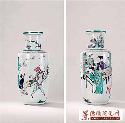 “清康熙 五彩人物故事紋棒槌瓶”2011年在北京保利以126萬元成交。所謂“青花則取其沈靜。五彩則喜其豪宕!薄短昭拧吩u點康熙五彩更以“奇詭”二字形容,與此器吻合。此康熙棒槌瓶所繪為月下人物聽曲,一人擊板,一人持戟表演,神情動作均極“豪宕”,旁有夫妻二人賞戲,果饌羅列,美酒佳肴,然樂而忘食,神情專注,故曰康熙五彩“所畫人物,每詼詭可怖,怪怪奇奇,千態(tài)萬狀,余不諳戲曲,不能名其妙”。康熙五彩之妙,有待方家細(xì)細(xì)品味。