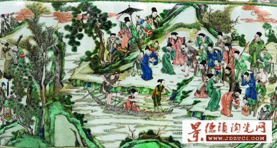 此原為洛陽橋故事中觀音巧取金銀以助蔡學(xué)士一節(jié)。畫面中蔡襄攜仆騎馬從山后而出,山前場地頗開闊,人群熙熙攘攘擠在江邊,即有豪紳鄉(xiāng)賢,又有市井民夫、乞丐走卒,皆是手持金銀元寶,或做欲投擲之態(tài),或正取金銀之姿,又有多人交頭接耳,熱鬧非凡。江中有花船一只,上有一老船夫掌篙,一紅衣妙女坐于船中,旁立一黃衣綠褂者,似為侍女。船中灑滿了從江岸上投來的金銀。人群外,呂祖攜樹精隱觀,或架云浮在空中,或藏身出在山后。用彩用色熱烈鮮亮,繪畫毫發(fā)爽利,構(gòu)圖奇幻富麗,應(yīng)屬同時(shí)期的康熙五彩上等細(xì)作。