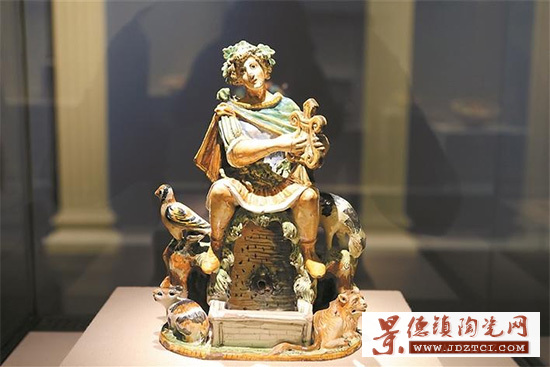 還有一些作品直接被塑為人形,比如16世紀(jì)末,由烏爾比諾的潘塔納茲工坊所作的人像水罐,表現(xiàn)的是傳說中半人半神的奧菲歐彈奏豎琴迷惑動物,他坐在一個圓桶上,液體從桶下方的小孔流入池中。據(jù)克勞迪婭·卡薩利介紹,這件產(chǎn)品專為私人居所而設(shè)計(jì),可能在豪奢的宴會上用作烈酒容器。