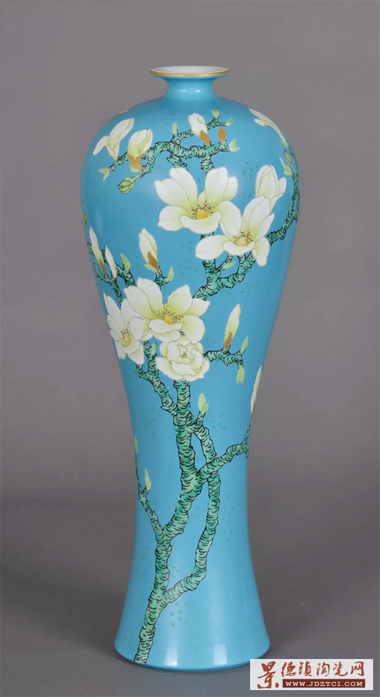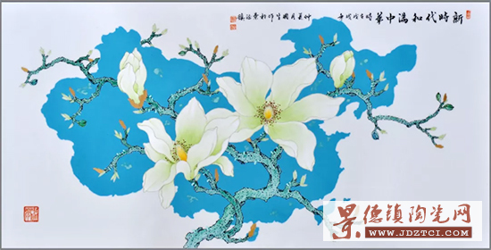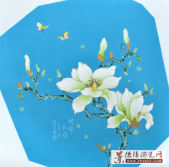 作為非物質(zhì)文化遺產(chǎn)“景德鎮(zhèn)傳統(tǒng)粉彩制作技藝—粉彩花鳥繪制”傳承人的周國生最開始采用的是粉彩工藝來表現(xiàn)玉蘭花,用低溫湖藍(lán)釉為底色,以本金描繪花托。后感到僅用粉彩工藝來表現(xiàn)花朵和枝葉尚顯不足,清麗柔美之中缺乏厚重感,于是周國生采用古彩工藝來表現(xiàn)樹枝及葉片,遒勁深沉的古彩黑色線條使枝葉更為突出厚重,與采用粉彩表現(xiàn)的清秀潔白的玉蘭花朵產(chǎn)生強(qiáng)烈的對比。還采用古彩的翡翠顏料在藍(lán)釉地上進(jìn)行點(diǎn)綴裝飾,既打破了藍(lán)釉底的單調(diào),又豐富了畫面構(gòu)圖和寓意。用本金描繪花托,還創(chuàng)造性地采用本金來描繪玲瓏石!秹簟废盗杏裉m花瓷畫作品采用了粉彩、古彩、金彩和顏色釉等多種工藝材料,工藝難度較高!秹簟废盗邪子裉m瓷畫作品至少需要三次燒成:先是入窯經(jīng)1200攝氏度以上的高溫?zé)伤卮砂滋,然后是入爐以700~800攝氏度低溫二次燒成藍(lán)色底色,再是入爐以800攝氏度左右低溫三次燒成粉彩、古彩、金彩等釉上彩料描繪的畫面。如釉上彩料燒成沒有達(dá)到預(yù)期的畫面效果,還需要進(jìn)行第四次甚至第五次燒成。因選用多種不同的工藝裝飾材料增加了作品的燒成難度。