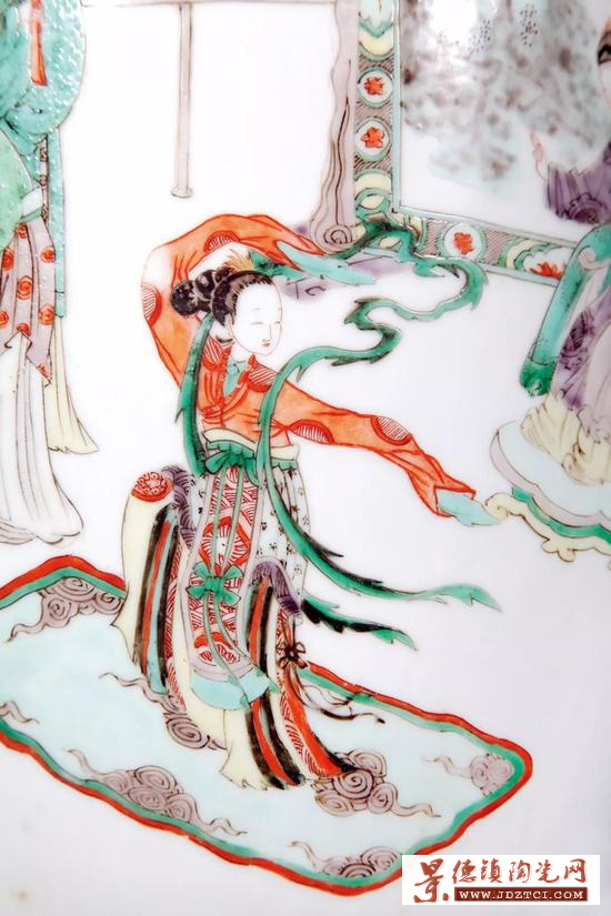 康熙瓷器之所以獲得如此高的評價,不僅僅是指此時制瓷技術(shù)的造詣,更是康熙瓷器所具有的藝術(shù)價值。自由社會環(huán)境下,使窯工的創(chuàng)造更加自信,也使得圖案更加有精神。大量出現(xiàn)的圖片素材和完善的釉上彩技術(shù),使瓷器畫匠能夠充分地發(fā)揮,剛勁有力的長短線結(jié)合,平涂的設(shè)色,使畫面比書本里的插圖更為引人入勝。而且,五彩的表現(xiàn)手法和風格都極有利于仕女圖的繪制,既可以將版畫中的人物形象生動的再現(xiàn),又可以賦予畫工自己想象的色彩,具有極強的觀賞性。
