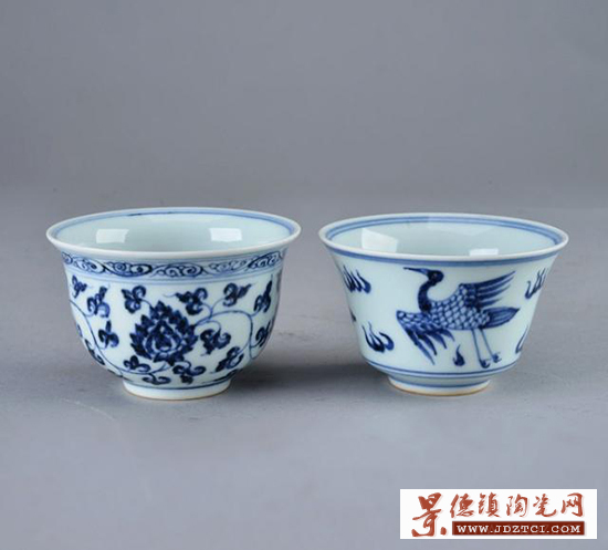 纏枝花卉仙鶴紋青花口杯一對,本品口微侈,圓弧腹,及底內(nèi)收,承接矮圈足,胎薄體輕,小巧可人。杯通體施白釉,釉汁潔白瑩潤,外壁青花施吉祥纏枝花卉紋和仙鶴紋,賞玩間不免使人清心靜悟,且為成對流傳,品相完美,保存至今,頗為不易。