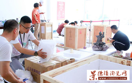 據(jù)拆件驗收組的工作人員劉建東介紹,全國美展陶藝展收到的入選復(fù)評作品,每一件都要專門打開檢驗,如有破損會及時聯(lián)系作者進行修復(fù)。需要修復(fù)的作品放在庫房里,外地參賽作者來景進行修復(fù)時,又要從庫房重新搬出來,來來回回,要拆裝幾次。正常拆一件包裝好的參賽作品需要20分鐘左右。很多大件的陶瓷作品因體積重量因素不能搬到現(xiàn)場拆件區(qū)的,只能存放在庫房里,工作人員必須冒著高溫進行拆件作業(yè),拆好后還需進行復(fù)原包裝,工作強度非常之大,拆件組的工作人員每天早上8點開始工作,一直工作到晚上11點。
