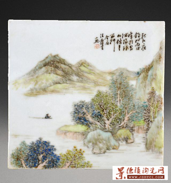 除了御窯廠眾多的畫師和圍繞著景德鎮(zhèn)陶瓷產(chǎn)業(yè)的大小紅店及作坊中的畫匠外,尚有不少成名的書畫家客串繪制淺絳彩瓷。如:在梁基永編著的《中國淺絳彩瓷》中就錄有海派畫家張熊(子祥)《四清圖》瓷板一塊,清末金石篆刻家黃士陵《松壽圖》四方帽筒一件。這些名噪一時的畫家的加入,間接地對淺絳彩瓷的發(fā)展起到了推波助瀾的作用。