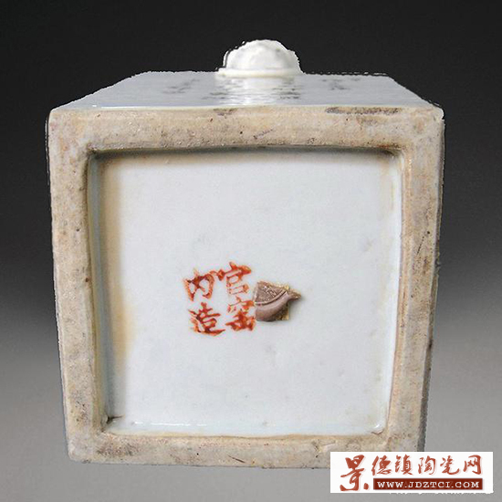 除了淺絳派“大家”的作品會落自己的名章和堂號齋名外,其他淺絳彩瓷作品會落年號款識或印章,其中以題識中落有“臣”字畫印(圖5)及底部有“官窯內(nèi)造”“官窯監(jiān)制”“同治年制”“光緒年制”手寫體礬紅款的器物為佳,而同治朝至光緒朝早期這一段時間的作品最為精妙(圖6),這從另一個角度印證了御窯廠的恢復(fù)以及御窯廠畫師的回歸。此時的淺絳彩瓷作品多為御窯廠畫師所做,一些淺絳名家所用瓷胎較為講究,器物造型規(guī)整,胎質(zhì)較為細(xì)膩、釉面潤澤、畫工較為文氣。底部戳印“官窯內(nèi)造”礬紅印章款器物的時間較前者晚些(圖7、圖8),其造型、胎質(zhì)及畫工等方面自然稍遜一些。蓋有“官窯內(nèi)造”印章只是為了表明這些器物是在官窯范圍之內(nèi)制作出來的,其品質(zhì)是有保障的,如同現(xiàn)今社會質(zhì)量認(rèn)證標(biāo)識一般。