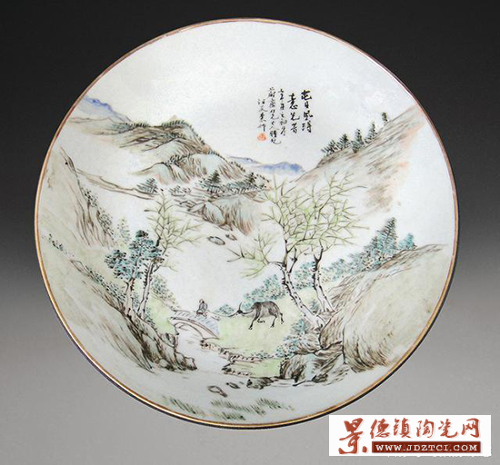 關(guān)于瓷上的題記和署名,在以往若干個世紀(jì)中,瓷器上鮮見工匠及畫匠的署名,古代有物勒工名的做法,但在陶瓷上,除秦漢和宋代會在陶瓷上落有標(biāo)記,其他年代則非常少見。淺絳派畫家勇敢地改變了這種狀況,第一次大規(guī)模的在瓷器上題記并署名,這是具有歷史意義的一刻。從此之后,景德鎮(zhèn)藝人都會在瓷器上寫下自己的名字和雅號,題上相應(yīng)的詩詞和題識,以及干支紀(jì)年,這種習(xí)慣促進(jìn)了淺絳派畫家對畫意及書法的理解,將“詩”“書”“畫”“印”這幾個中國傳統(tǒng)繪畫元素完整的運(yùn)用到瓷器繪畫之上(圖1圖3),進(jìn)而推動了淺絳彩瓷繪畫藝術(shù)的發(fā)展。正是基于這一點(diǎn),我們才能在缺乏相關(guān)史料情況下,通過具體的淺絳派瓷上彩繪作品來研究晚清淺絳畫派的風(fēng)格及發(fā)展?fàn)顩r。