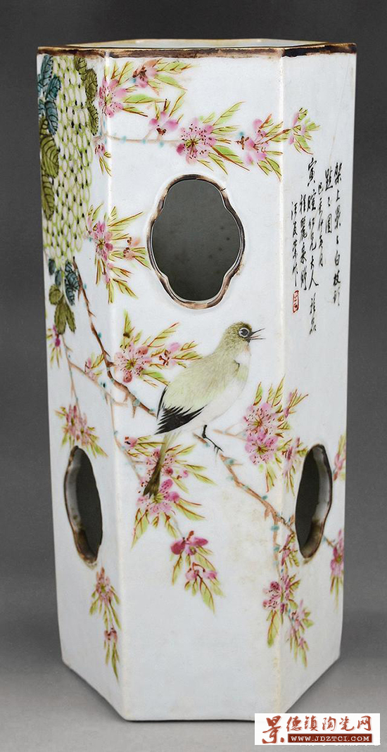 圖11 汪友棠淺絳花鳥紋六方鏤空帽筒