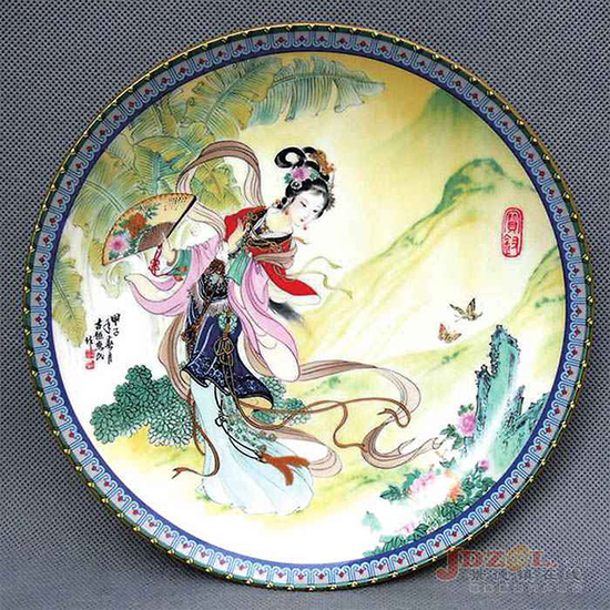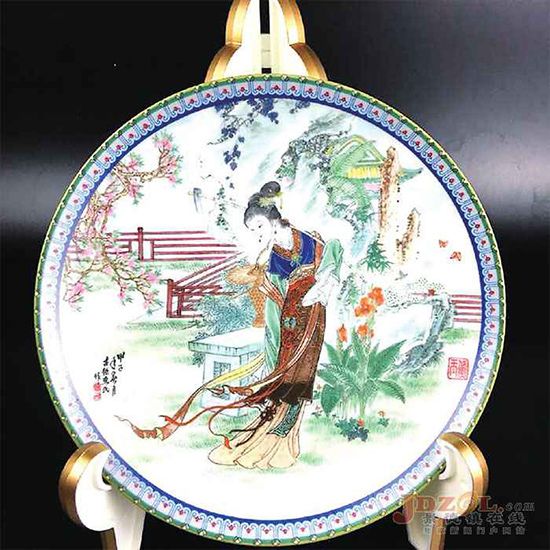 據(jù)《當(dāng)代官窯》載,首套彩盤由趙惠民先生設(shè)計繪制,這就是聞名中外的《紅樓夢金陵十二釵》。金陵十二釵廣為人知,耳熟能詳,寶釵、黛玉是中國文學(xué)長廊中的經(jīng)典藝術(shù)形象,“玉帶林中掛,金釵雪里埋”,感動和迷倒了無數(shù)國人。彩盤一套12集(塊),1985年10月投入生產(chǎn),首集《寶釵撲蝶》于1986年3月運抵美國芝加哥發(fā)行,正式進(jìn)軍美國彩盤中心。