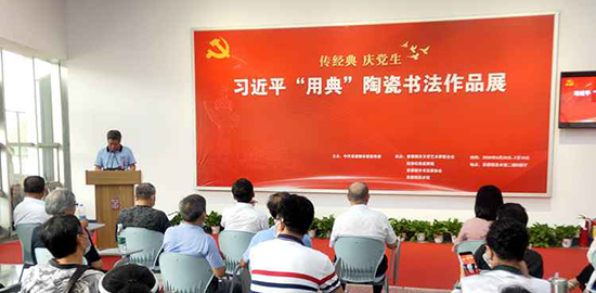市文聯(lián)負(fù)責(zé)人在致辭中表示,這是一場思想和藝術(shù)完美結(jié)合的高層次展覽,是對習(xí)近平“用典”名句的藝術(shù)呈現(xiàn),傳遞了黨的聲音和社會的正能量,對于我們學(xué)習(xí)領(lǐng)會習(xí)近平新時代中國特色社會主義思想,增強文化自信和使命擔(dān)當(dāng),不斷推動社會主義文化繁榮興盛,具有十分重要的意義;這是一場書法與陶瓷深度融合的高層次展覽,不僅讓收藏在博物館里的文物、陳列在廣闊大地上的遺產(chǎn)、書寫在古籍里的文字都“活”了起來,更有力地宣傳、推廣和弘揚了陶瓷書法的無窮魅力,是在用陶瓷講好中國故事,傳遞著中國聲音。希望通過這場展覽,讓我們在學(xué)習(xí)習(xí)近平總書記用典中,進一步深入領(lǐng)會其中精神和思想精髓,從中汲取中華優(yōu)秀傳統(tǒng)文化豐富營養(yǎng),提升自身的素質(zhì);推動全社會對傳承傳統(tǒng)文化的關(guān)注,更好地傳承中華優(yōu)秀傳統(tǒng)文化,踐行社會主義核心價值觀,增強民族認(rèn)同感和使命感;帶動廣大文藝家和文藝工作者們自覺地融入創(chuàng)作中,投身到景德鎮(zhèn)國家陶瓷文化傳承創(chuàng)新試驗區(qū)建設(shè)中,扛起肩負(fù)的使命和擔(dān)當(dāng)。