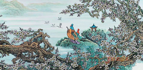 趙惠民先生的《中國(guó)百花仙女》彩盤,其中一幅以梅花神壽陽公主為主圖案,披紅裘,執(zhí)枝條,左側(cè)一株梅莖,紅蕊紛綻,右側(cè)幾莖梅枝旁逸而出,兩只白羽丹頂鶴一昂立一蹲伏。整個(gè)畫面云霧繚繞,去盡煙火氣,宛若仙境。