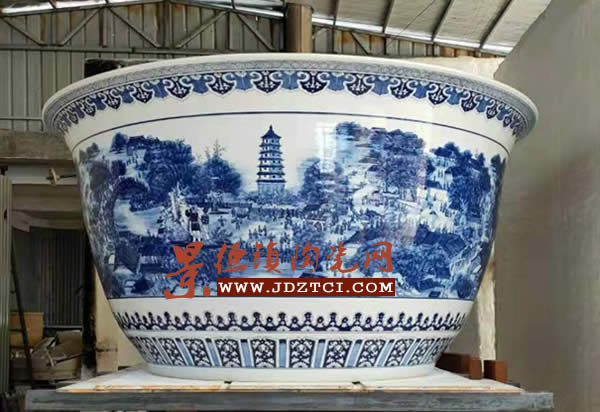 該青花瓷碗選用了景德鎮(zhèn)優(yōu)質(zhì)的高嶺土原料,瓷碗重量達2噸,成品碗口直徑2.72米、底部直徑1.59米、高1.39米,釉面光潔,選用青花繪制清明上河圖,上千個人物栩栩如生、形態(tài)各異;小橋、流水、商賈;展現(xiàn)了宋代商業(yè)一派繁榮、熱鬧的景象。上下采用了中國傳統(tǒng)的裝飾紋案。