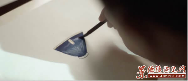制作“翠羽星藍杯”需要吹兩種釉。第一次吹釉的時候,需要根據(jù)器皿的走向,先在外部由下往上吹釉,再施內(nèi)釉。吹釉過程中形成的顆粒會成為一個凝固層,這樣一層一層地吹釉,會在坯體上形成一個夾層。