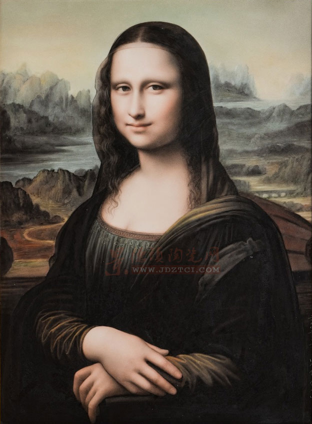 中國(guó)工藝美術(shù)大師馮杰老師擅長(zhǎng)人物肖像,畫面細(xì)致入微,人物栩栩如生。作品取材文藝復(fù)興時(shí)代達(dá)芬奇所繪的麗莎·喬宮多的肖像畫《蒙娜麗莎》。結(jié)合瓷板畫的技術(shù)將曠世藝術(shù)品轉(zhuǎn)移到千年不腐的陶瓷載體上。作品的人物細(xì)節(jié)描繪細(xì)膩,蒙娜麗莎臉上那微抿的嘴唇,微挑的眼角和微凝的雙目,悄然露出一種恬靜、淡雅而又神秘的微笑,自然、純真、樸素地將一絲不易察覺(jué)的、充滿著人性情感的內(nèi)心活動(dòng)透溢出來(lái)。畫中人物姿態(tài)優(yōu)雅、笑容微妙,背景山水幽深茫茫,體現(xiàn)了奇特的煙霧狀“空氣透視”的筆法。蒙娜麗莎雙手隨意交搭著,肌膚柔潤(rùn)而豐滿,結(jié)構(gòu)精謹(jǐn)而準(zhǔn)確,狀態(tài)自然而生動(dòng),一種富有青春生命力的血液正在指掌間流淌,這是鮮活而富有生命力的藝術(shù)表現(xiàn)。瓷上肖像畫作品揉進(jìn)了油畫的色彩、素描的線條,和中國(guó)明清肖像畫的傳神特點(diǎn),經(jīng)過(guò)多次次描繪和高溫?zé)疲胚_(dá)到現(xiàn)在的藝術(shù)效果。