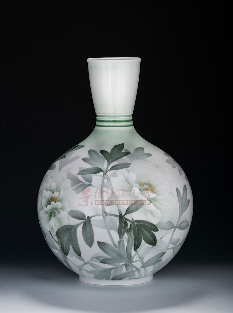 器形與紋飾的呼應(yīng):作品采用天球瓶造型(源自明代永宣官窯,象征“天圓地方”的宇宙觀),圓潤飽滿的瓶身與舒展靈動的葉片、嫵媚的牡丹相得益彰,瓶頸處刻三環(huán)紋飾,既簡潔秀雅,又暗含“天地人”三才的哲學意蘊。