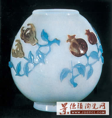 清代的「料」或「料質(zhì)」,乃坊間俗稱;山東人稱之為琉璃。若我們分析其成份,則應(yīng)屬於一種鉀鈣或鉀硅玻璃。清代御製的料器媲美官精瓷:康熙時期已被視為「采澤興潤,踰於眾玉」。像附圖似圓燈罩的小瓶,即為那個時期的料器,現(xiàn)今值數(shù)萬港元;其白底真的溫潤如玉,但並不透明,左方有肖浮雕的佛手,右方為莖葉呈粉藍(lán)色的石榴。這種清代料器清麗典雅,令人賞心悅目。
